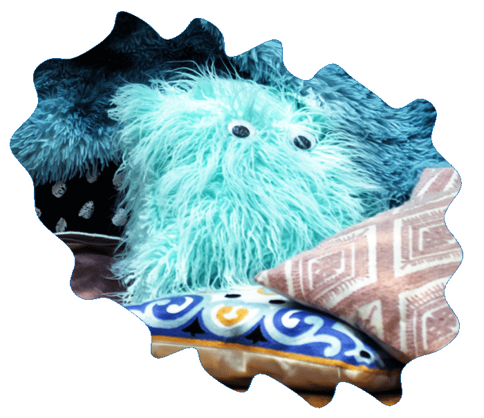 There are pillows and people and plenty of colours and texture. Looking more closely, on one side there are 4 people touching each other’s limbs and bodies gently, seemingly forming one larger connected body through having their hands on someone else’s ankle or knee. On the other side, a person hugs a pillow tightly while watching the other 4.